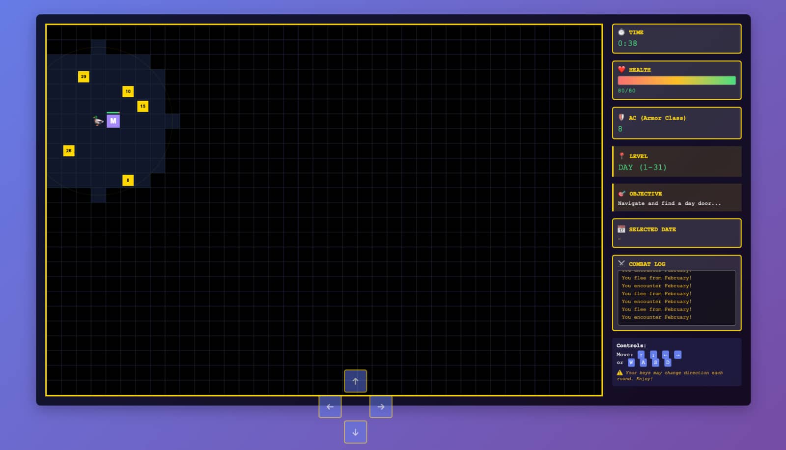 This is “Datehack”, a game modelled on the classic rogue “Nethack”, where you have to explore a dungeon filled with dates over various levels, while not being killed by the months of the year (monthsters).