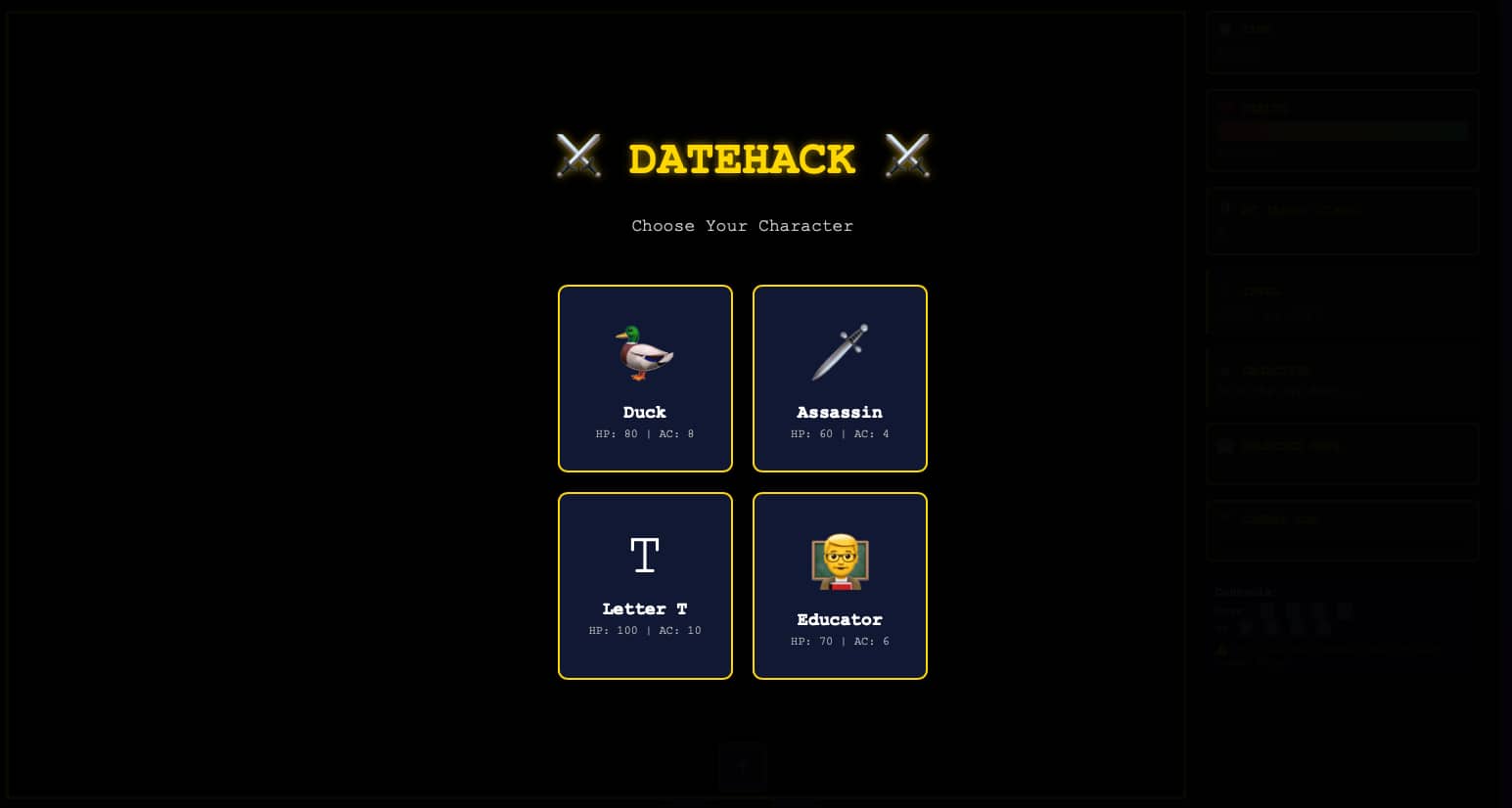 You can choose your character between a Duck, an Assassin, the letter T, and an Educator (every first letter together spells “DATE”), and each comes with hit points and an attack.